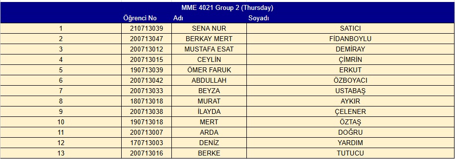 MME 4021 Materials Processing Laboratory MME 4021 Materials Processing Laboratory (2025-2026 FALL) LABORATORY SAFETY You have to pass the laboratory safety exam before starting experiments. (You have to take at least 70 point from exam) Please read the laboratory safety manual for undergraduates. (You can download from here) Laboratory Safety Exam will be held on 25.10.2025 Thursday 11:00 at CZ-07 Classrooms GENERAL INSTRUCTIONS It is obligatory to wear laboratory apron (lab coats) will not be admitted to the laboratory without it. The nature of working in groups implies that there should be cooperation and discussion between members of the group and the lab instructor. It is, however, expected that when students prepare their reports, that they do so individually using their own words and interpretation. Plagiarizing or blatant copying of a report or reference will result in an automatic zero for that lab for the first offense. A second offense will result in an automatic FF grade for the course. Students are responsible to submit the lab reports on the same day until 17.00 a week after the experiment to responsible assistant. Students who didn't attend the experiments will not be accepted the lab reports. That reports grade will be zero. LABORATORY GROUPS This course will be held on in three student groups. Please check your group and date of the course. EXPERIMENT SCHEDULE EXPERIMENT MANUALS and REPORT UPLOAD Report Cover Page Template Every report must have report cover page. Experiment 1 Manual Report #1 Upload (You should upload your experiment report until 06.10.2025 23.59 for Group 1, 08.10.2025 23.59 for Group 2. Reports must be in PDF format and include report cover page. Every late days will be -5 points on your report grade.) Experiment 2 Manual Report #2 Upload (You should upload your experiment report until 13.10.2025 23.59 for Group 1, 15.10.2025 23.59 for Group 2. Reports must be in PDF format and include report cover page. Every late days will be -5 points on your report grade.) Experiment 3 Manual Report #3 Upload (You should upload your experiment report until 20.10.2025 23.59 for Group 1, 22.10.2025 23.59 for Group 2. Reports must be in PDF format and include report cover page. Every late days will be -5 points on your report grade.) LABORATORY QUIZ AND REPORT GRADES ...Will be announced later.